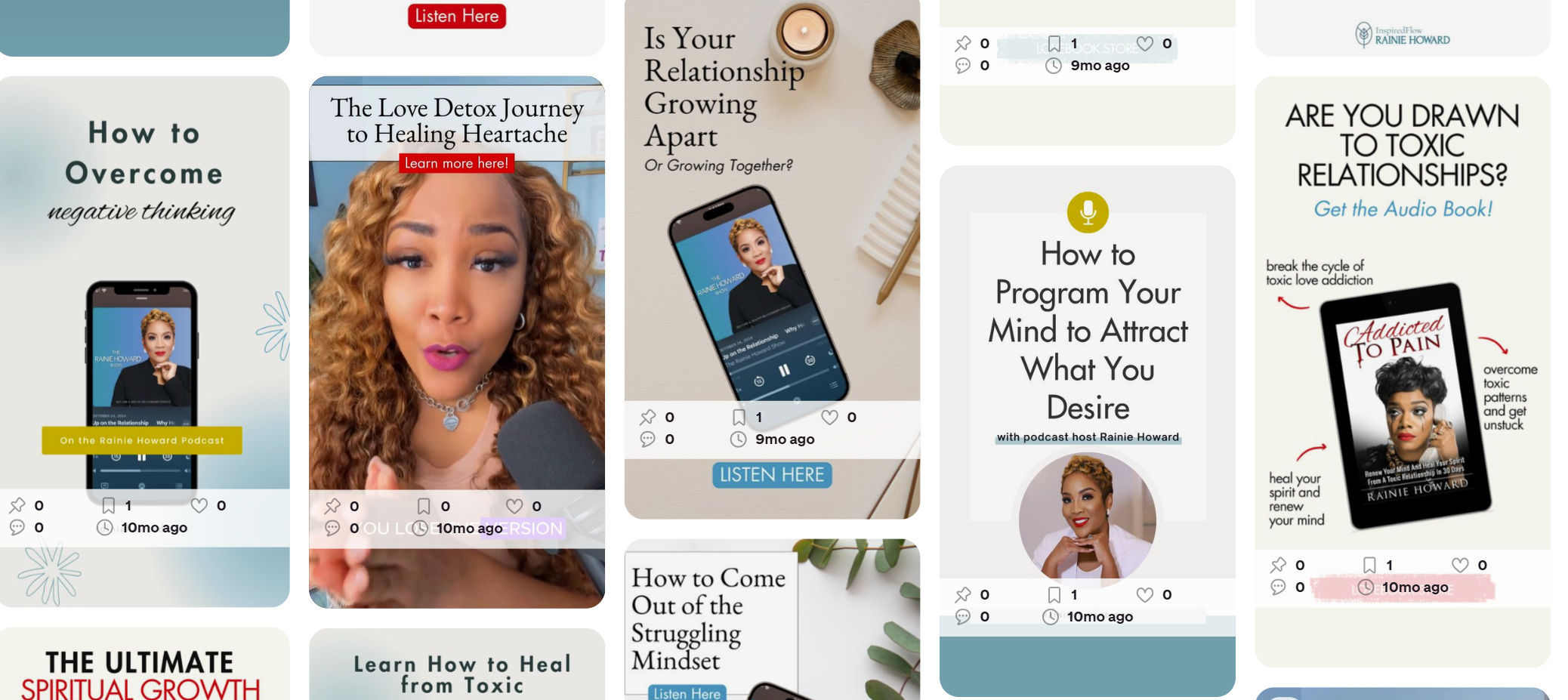 Our work speaks for itself.Updating the Pinterest banner ensures the account clearly communicates Rainie Howard’s brand, expertise, and value at first glance, creating a more cohesive and professional impression. A strategically designed banner also reinforces credibility and helps align her profile with search intent and audience expectations, improving overall engagement and trust.